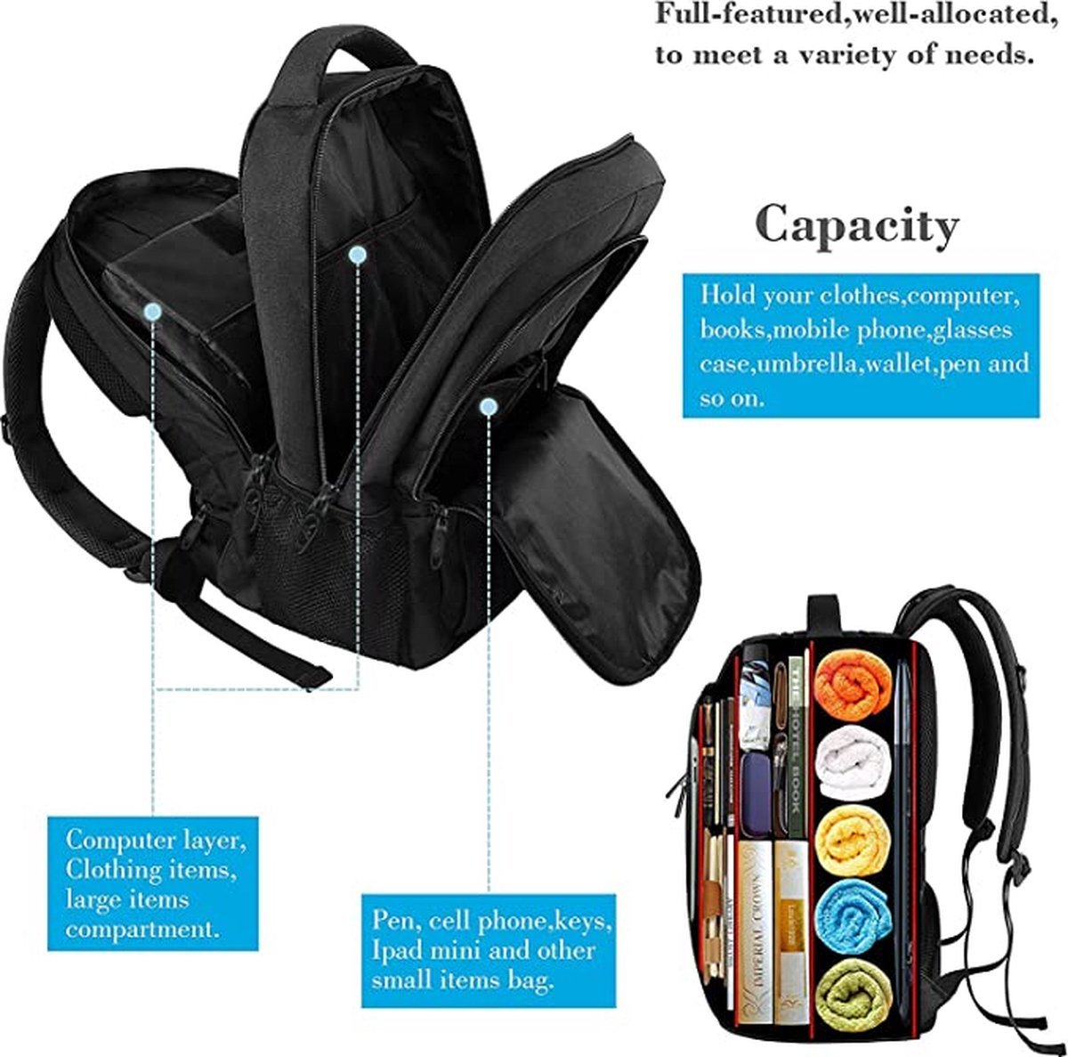 PS rugzak 36 liter met USB oplaadpoort, veel vakken, geschikt voor laptop, als schooltas, waterbestendig, voor dames en heren,handig en mooi in de kleur zwart
